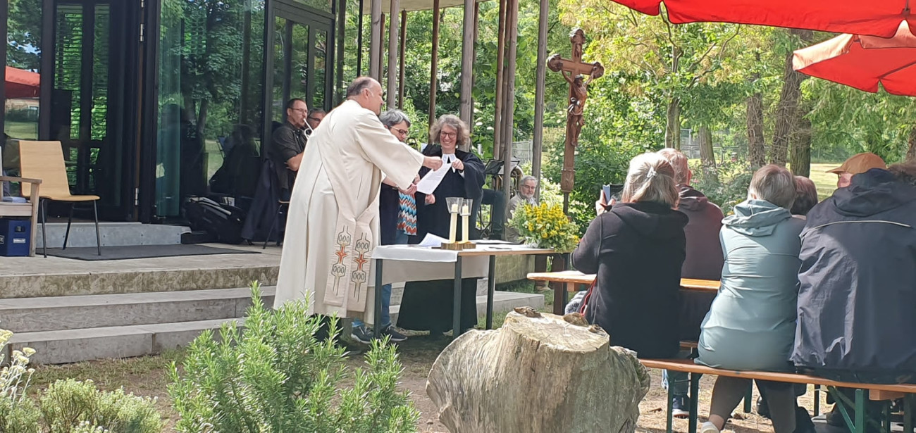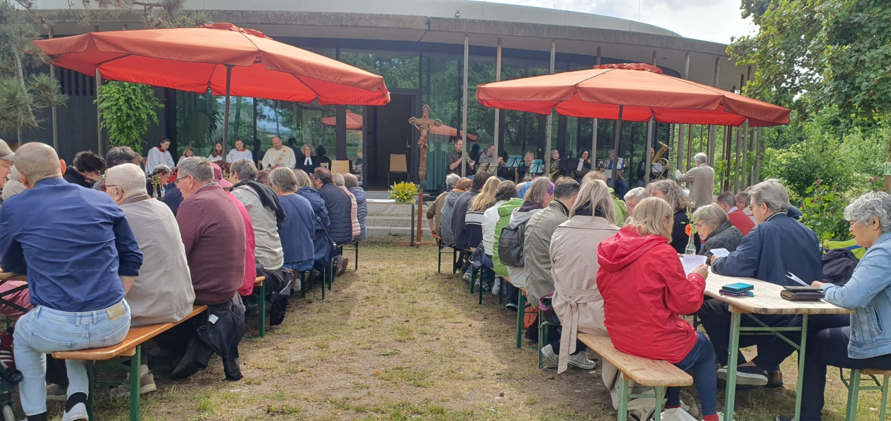 Bei perfektem Wetter konnten die Gemeinden Heiligkreuz, St Elisabeth und St Burkard, sowie Zell und Deutschhaus-Erlöser gemeinsam den schon traditionell ökumenischen Gottesdienst miteinander feiern. Die Umweltstation war auch im zweiten Jahr ein sehr schöner Ort dafür. Musikalisch begleitet wurde der Gottesdienst vom Posaunenchor der Deutschhaus-Erlöser Gemeinde unter der Leitung von Johannes Willnecker. Dabei wurden schöne Schöpfungslieder, z.B. Wie lieblich ist der Maien, ebenso gesungen, wie die Himmelfahrtslieder – Wir feiern deine Himmelfahrt oder Der Himmel geht über allen auf. Diakon Wagenhäuser und Pfarrerin Vincent hatten den Gottesdienst miteinander geplant. In ihrer Dialog-Predigt stellten sie die Frage, wo Gott denn wohne. In unseren Kirchen kann man ihn nicht fassen, wie das schon König Salomo bei der Einweihung des ersten Tempels festgestellt hatte, und doch ist es gut, sie zu haben und auch dort Gott begegnen zu können. Er ist dabei in allen Menschen und Situationen, auch in den besonders schweren und besonders schönen.