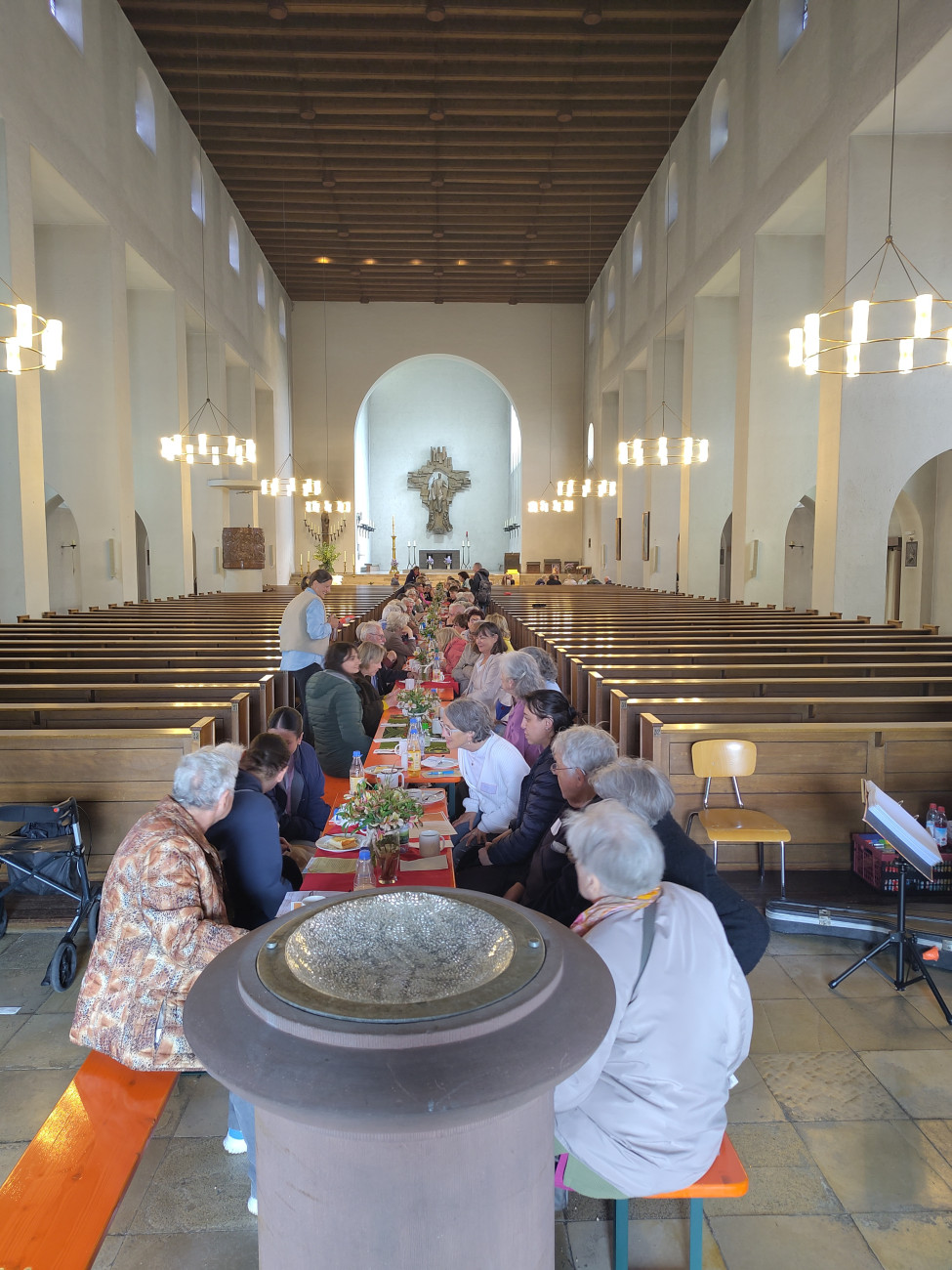 Am letzten Mittwoch im Mai waren alle in der Zellerau eingeladen zur Kaffeetafel, organisiert vom Quartiersmanagement und etlichen anderen, sozialen Organisationen. Wetterbedingt in der Kirche waren Biertische durch den langen Mittelgang der Heiligkreuz-Kirche aufgebaut. Etwa 200 Gäste kamen und wurden mit Kaffee und Kuchen, sowie anderen kalten Getränken, mit Gesang und guter Stimmung verwöhnt und konnten dabei gut miteinander reden, mehr über Angebote zum Miteinander im Stadtteil erfahren, Fragen stellen und Menschen treffen, denen sie immer wieder begegnen, nur oft nicht so einfach zum Gespräch wie hier.